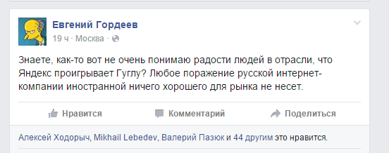 Евгений Гордеев как-то написал в Facebook: Знаете, как-то вот не очень понимаю радости людей в отрасли, что Яндекс проигрывает Гуглу? Любое поражение русской интернет-компании иностранной ничего хорошего для рынка не несет.